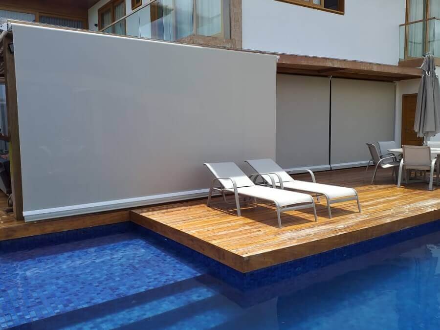 Modelo estilo cortina com excelente proteção para chuva e sol. Fechamento elegante e discreto para varandas, áreas gourmet e ambientes comerciais.